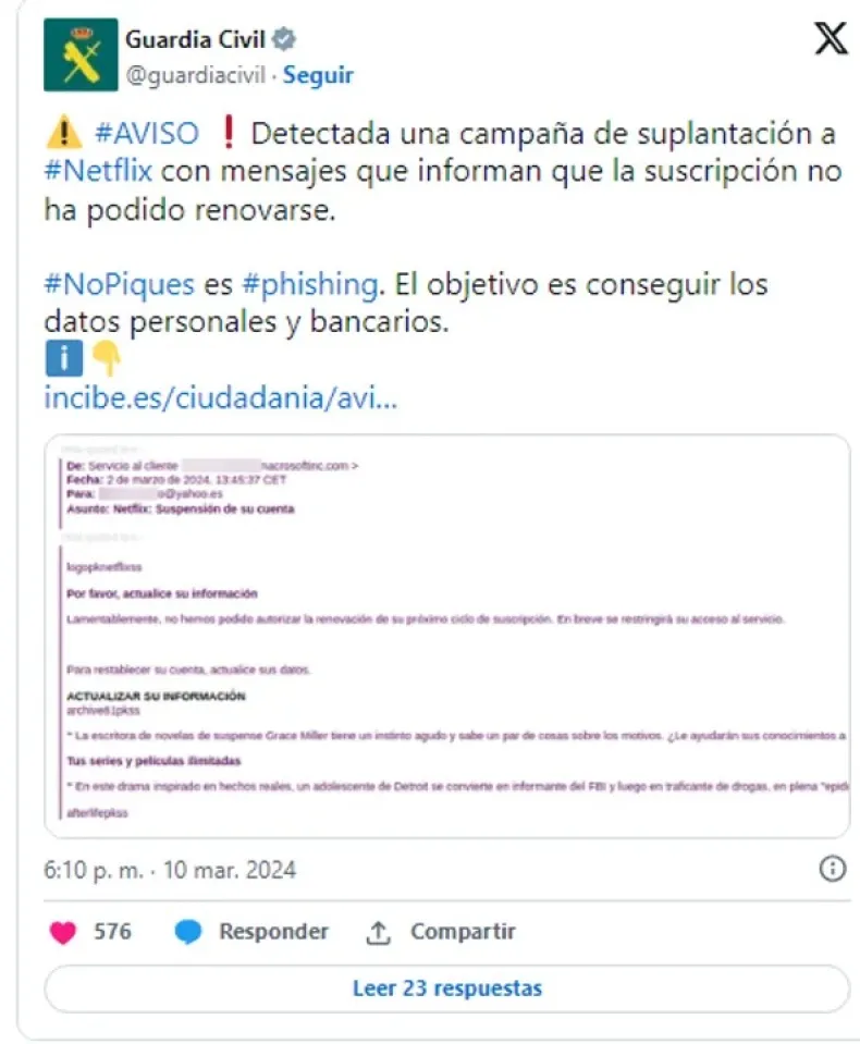 Según se indica en un post en X, los criminales envían correos electrónicos a sus víctimas. En él se indica que es necesario que se actualicen los datos de pago, porque, si no, la suscripción no se renovará.