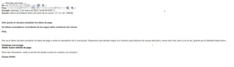 Además, en ninguno aparece ningún logotipo de Netflix o información personal del usuario, esto último indica que los criminales envían varios esperando que alguno cuele.