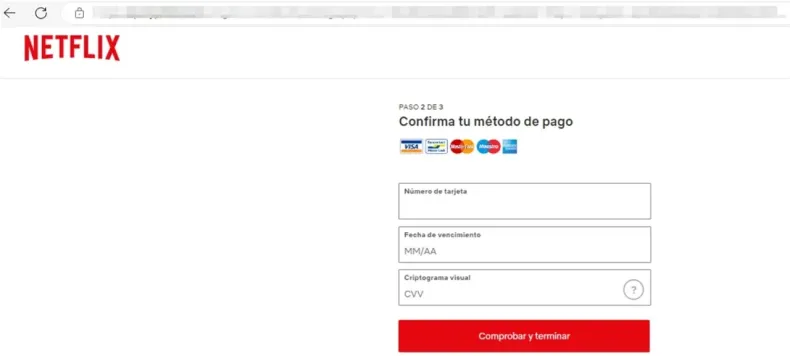 En el mail envían un enlace, que redirige a una web falsa que simula la de Netflix. Es en ella donde se implementa un cuestionario con diversos campos en el que la víctima introducirá su información personal, como su nombre, dirección o código postal. Luego avanzará al siguiente cuestionario, que le pedirá la información bancaria.