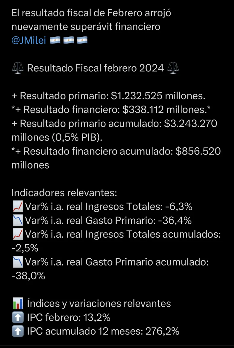 Caputo difundió estos datos horas después de que el DNU fuera rechazado por parte del senado. Destacó que la variación de los ingresos totales en términos reales fue de -6,3% y la variación real del Gasto Primario del -36,4%.