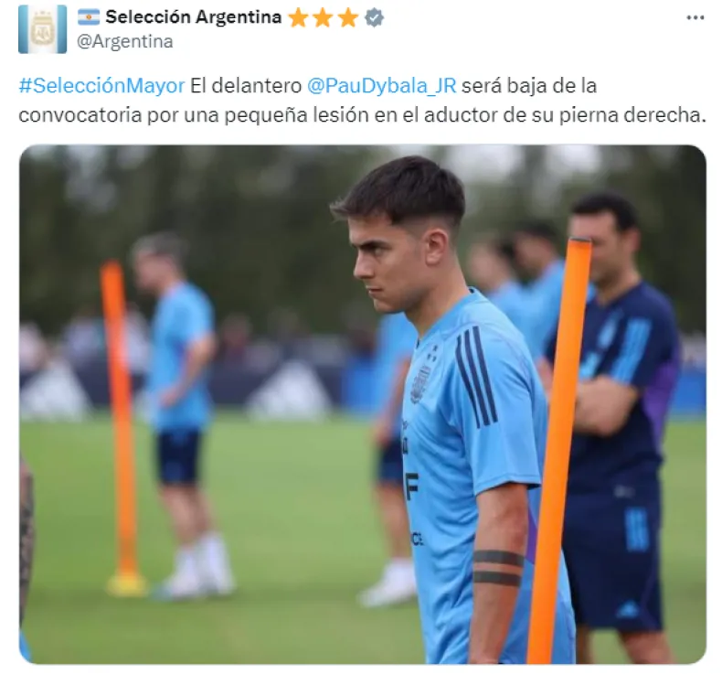 "La Joya" es el segundo jugador seleccionado por Scaloni que se baja a último momento. El primero fue Marcos Senesi, quien sufrió una molestia muscular jugando para Bournemouth. En su lugar el entrenador citó a Nicolás Valentini, de Boca.