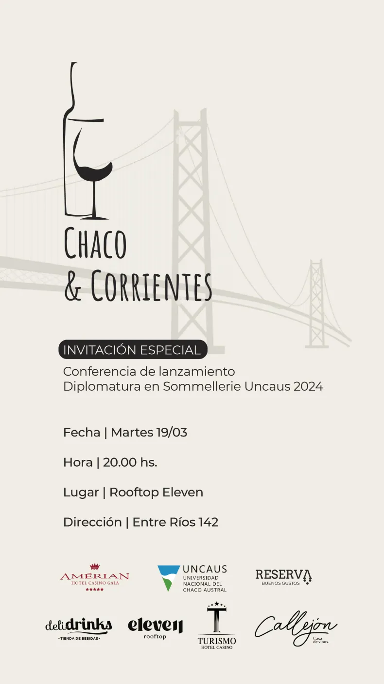 La Universidad Nacional del Chaco Austral invita este martes a las 20 a la Conferencia de Lanzamiento de la Diplomatura en Sommellierie Uncaus 2024. El encuentro será en Rooftop Eleven ubicado en Entre Ríos 142 en la ciudad de Resistencia.