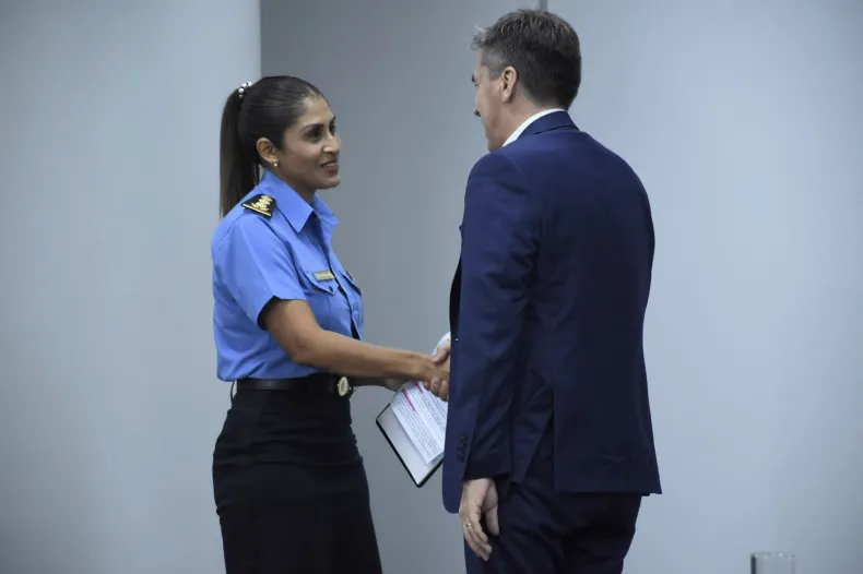 Acompañaron al gobernador en este acto, el ministro de Seguridad, Hugo Matkovich, el secretario coordinador de Gabinete, Livio Gutiérrez, la subsecretaria de Acción Comunitaria, Tamara Silvestri, el Jefe de Policía, Fernando Romero y Subsecretaria de Narcotráfico y la Comisario General, Analía Verónica Ramírez.