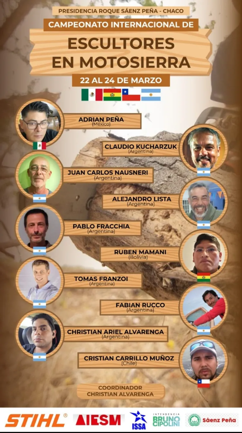 En esta oportunidad serán 10 los escultores que participarán del desafío con motosierras: Adrian Peña de México, Claudio Kucharzuk de Argentina; Juan Carlos Nauseri de Argentina; Alejandro Lista Argentina; Pablo Fracchia; Ruben Mamani de Bolivia; Tomas Franzoi de Argentina; Fabian Rucco de Argentina; Christian Ariel Alvarenga de Argentina y Cristian Cariilo Muñoz de Chile.