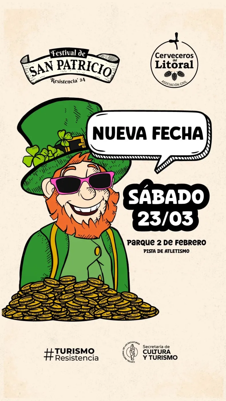 Anunciaron una nueva fecha para el festival de San Patricio, que fue postergado el pasado fin de semana por el temporal en Resistencia. El evento será este sábado 23, en la pista de atletismo del parque 2 de Febrero.