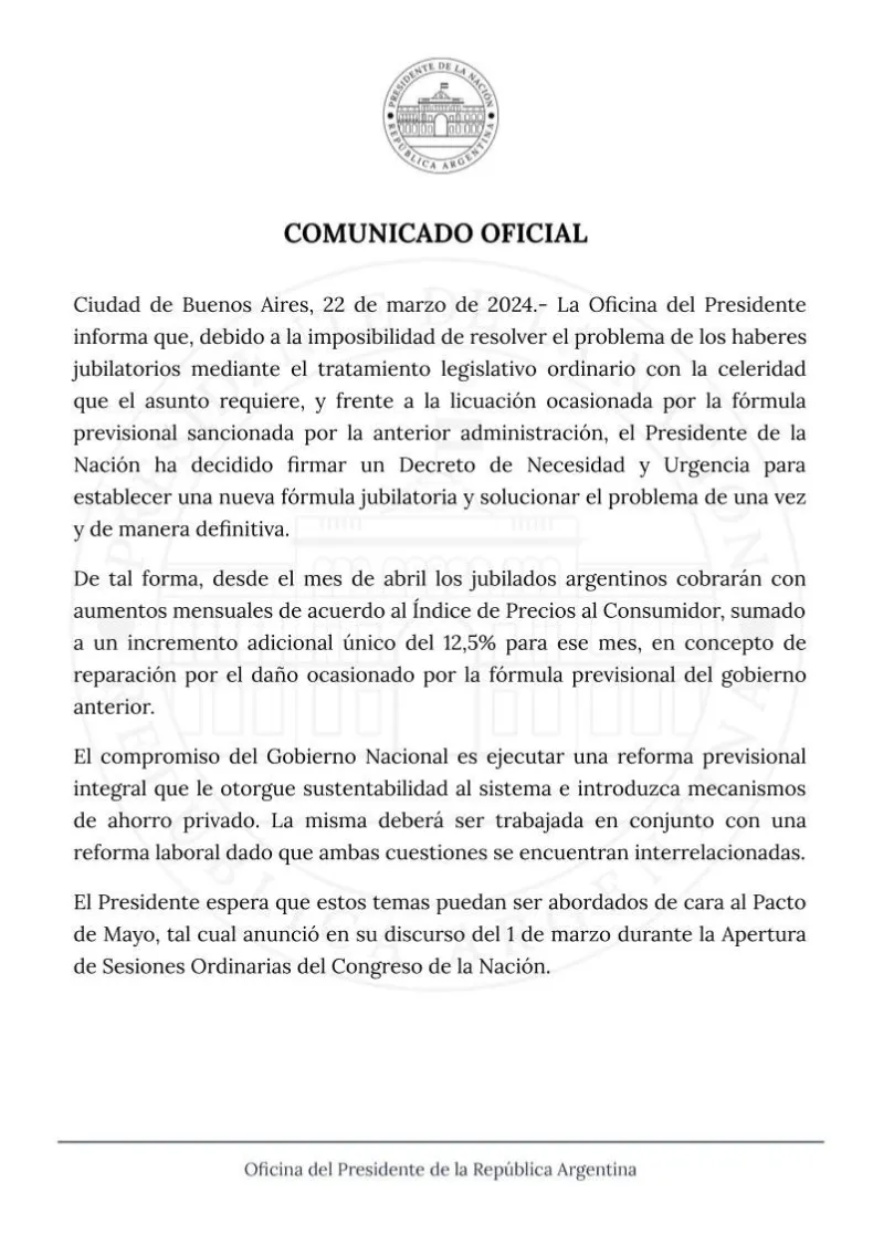 "La Oficina del Presidente informa que, debido a la imposibilidad de resolver el problema de los haberes jubilatorios mediante el tratamiento legislativo ordinario con la celeridad que el asunto requiere, y frente a la licuación ocasionada por la fórmula previsional sancionada por la anterior administración, el Presidente de la Nación ha decidido firmar un Decreto de Necesidad y Urgencia para establecer una nueva fórmula jubilatoria y solucionar el problema de una vez y de manera definitiva", comunicaron desde Nación.
