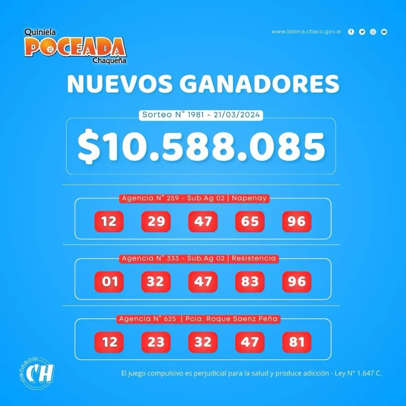 En el sorteo de este jueves 21 de marzo, la Poceada Chaqueña dejó tres nuevos ganadores. Los afortunados se llevaron un premio superior a 10 millones de pesos cada uno. Los números de la suerte fueron: 01, 12, 23, 29, 32, 47, 65, 81, 83 y 96.