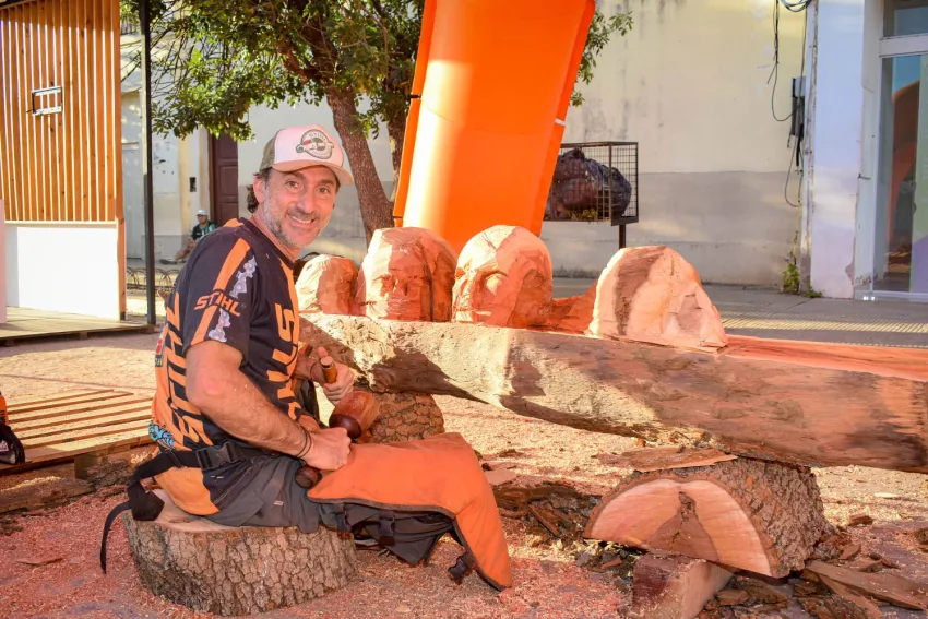Los escultores se encuentran trabajando a pleno en el segundo día del Encuentro Internacional de Escultores en motosierras que tiene lugar en calle 7 entre 10 y 12 de plaza San Martín de la ciudad termal.