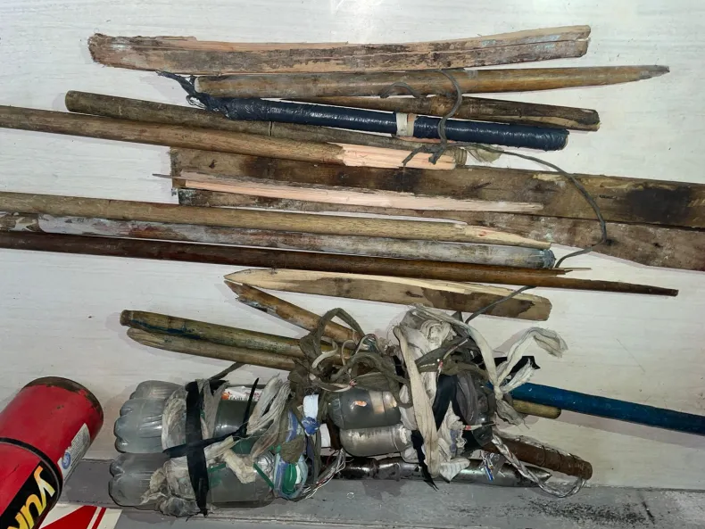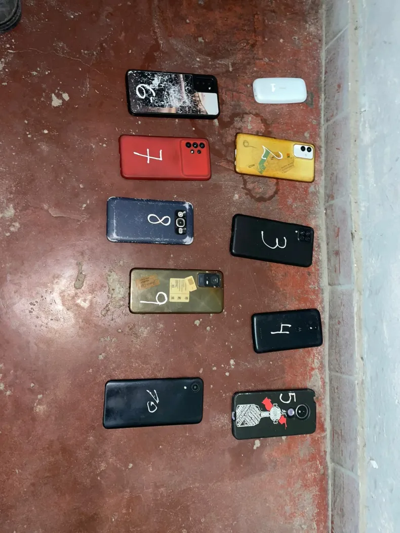 Además, se confiscaron un total de 10 teléfonos celulares y varios objetos contundentes, como palos de madera de diferentes tamaños y con extremos afilados, que se encontraban en la celda.