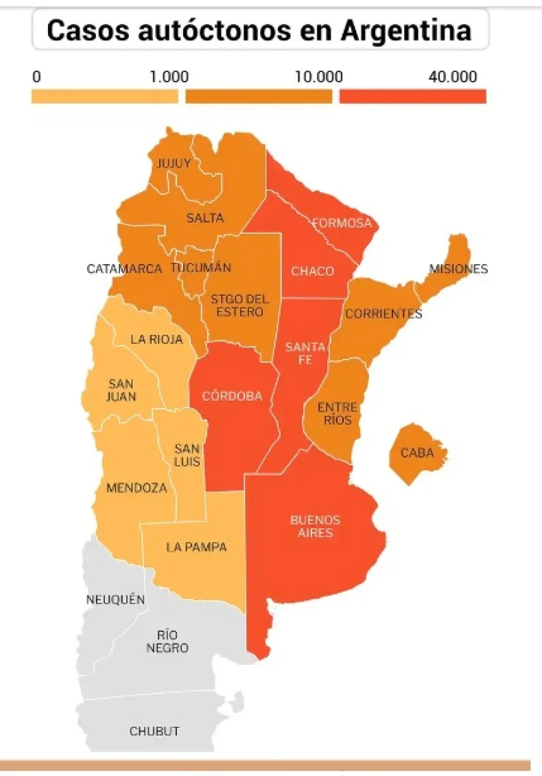 Chaco encabeza el ranking de las provincias con más casos, 15.832. La siguen Formosa con 8.360 y Catamarca con 5296. En la presente temporada se han identificado hasta el momento 3 serotipos circulando en el país: DEN-1, DEN-2 y DEN-3, con predominio de DEN-2 seguido de DEN-1.