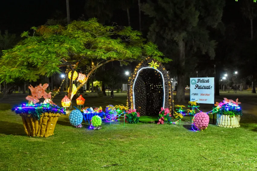 En vísperas de la Pascua, la plaza Juan B. Justo, de calle 12 entre 3 y 5 del Ensanche Sur, luce decorada con motivo de la misma. Allí los vecinos se encontrarán con adornos hechos de botellas plásticas pintadas e iluminadas por las noches.