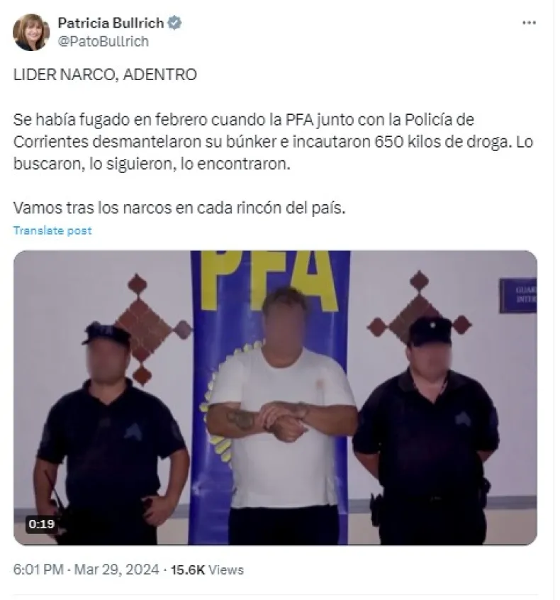 "LIDER NARCO, ADENTRO. Se había fugado en febrero cuando la PFA junto con la Policía de Corrientes desmantelaron su búnker e incautaron 650 kilos de droga. Lo buscaron, lo siguieron, lo encontraron. Vamos tras los narcos en cada rincón del país", posteo la ministra.
