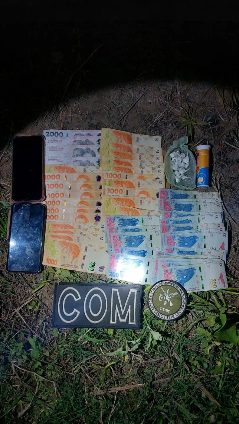 Ya con el hombre demorado, la Policía ordenó al sujeto de 27 años que exhibiera sus pertenencias. Allí, de uno de sus bolsillos sacó dos teléfonos celulares y un recipiente cilíndrico de color blanco. Este último contenía 16 "bochitas" de cocaína con un peso total de 9,59 gramos. Además, los agentes incautaron la suma de treinta y seis mil pesos distribuidos en billetes de distintas denominaciones.