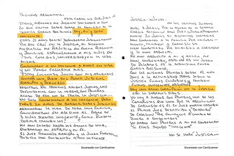 En la carta, dice que está "luchando con sus abogados contra una parte del Poder Judicial corrupto y perverso". "Nosotros no teníamos amigos jueces, nos defendemos con la verdad, con pruebas. ¿Acaso de eso no se trata la justicia?.. No sólo condenaron a un inocente para tapar 20 años de barbaridades judiciales, arruinaron la vida de toda una familia, convirtieron en asesino al padre de tres hijos siendo inocente, ¿cómo pueden dormir tranquilos?", indicó.