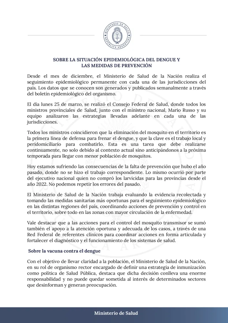 Por otro lado, también aclararon sobre su decisión de no lanzar una campaña de vacunación masiva contra el dengue: "Dicha decisión conlleva una enorme responsabilidad y no puede quedar sometida al interés de determinados sectores que desinforman y generan preocupación".