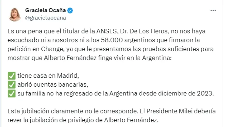 "Es una pena que el titular de la ANSES, De Los Heros, no nos haya escuchado ni a nosotros ni a los 58.000 argentinos que firmaron la petición en Change, ya que le presentamos las pruebas suficientes para mostrar que Alberto Fernández finge vivir en la Argentina", publicó Ocaña en su cuenta de X, en la que enumeró que el ex presidente "tiene casa en Madrid, abrió cuentas bancarias y su familia no ha regresado de la Argentina desde diciembre de 2023".