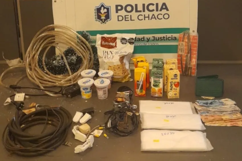 El sujeto tenía en su poder un pan dulce, nueve jugos, cuatro yogurts, tres paquetes de bolsas de nilón de 20 x 30, un sistema eléctrico de ventilador, cinco conectores de fluorescentes, 10 metros de luces de navidad, un tramo de cable trifásico del 6mm, un tramo de cable trifásico de 4mm, y dinero en efectivo.