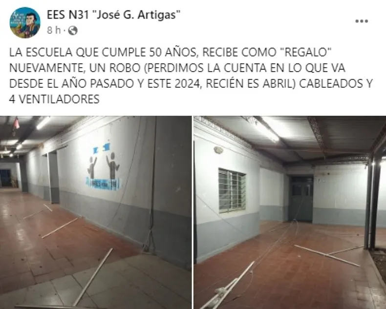 Es el décimo robo en un año. Las autoridades de la Escuela N°31 "José G. Artigas" se vieron obligados a tomar medidas debido al robo de cables y ventiladores.