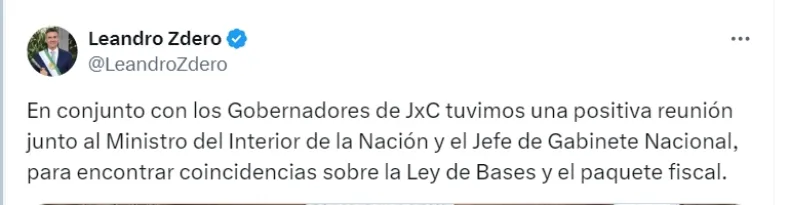 "En conjunto con los Gobernadores de JxC tuvimos una positiva reunión junto al Ministro del Interior de la Nación y el Jefe de Gabinete Nacional, para encontrar coincidencias sobre la Ley de Bases y el paquete fiscal", expresó Zdero en su cuenta de X.