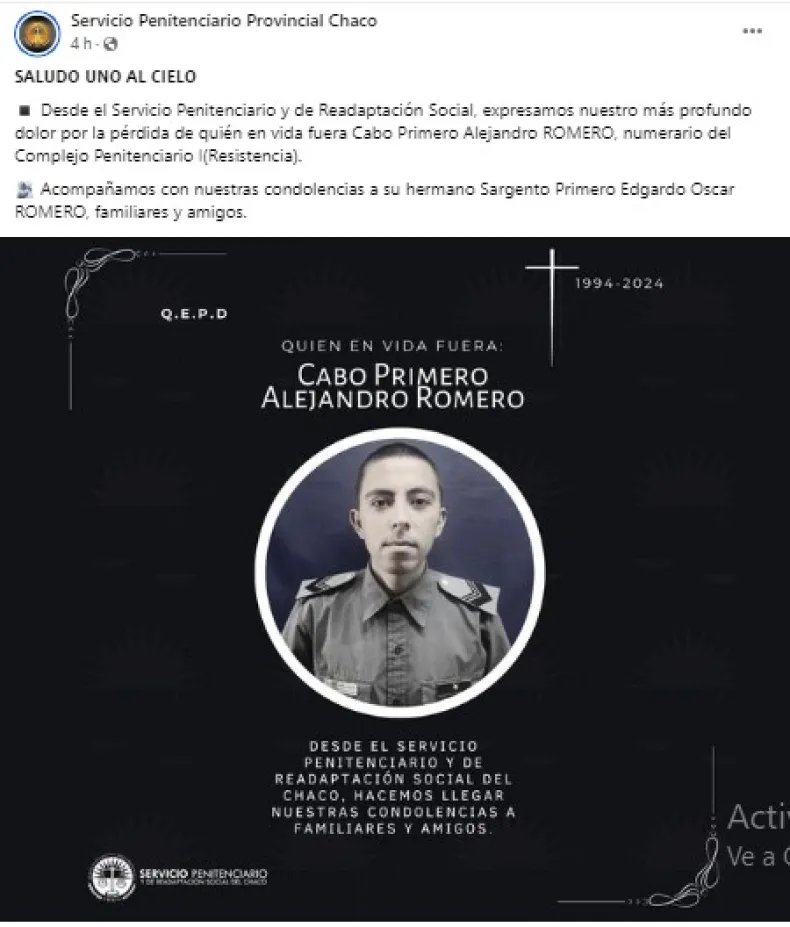 "Desde el Servicio Penitenciario y de Readaptación Social, expresamos nuestro más profundo dolor por la pérdida de quién en vida fuera Cabo Primero Alejandro ROMERO, numerario del Complejo Penitenciario I(Resistencia)", expresaron desde la fuerza.