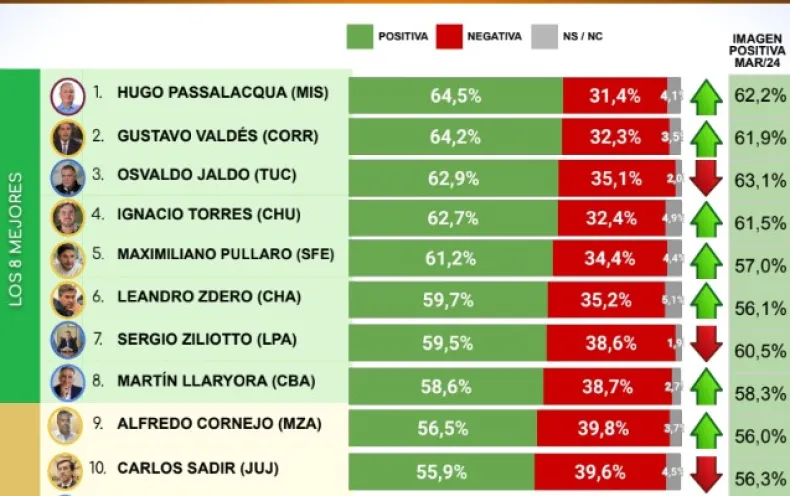 El top diez de los gobernadores se completa por: Ignacio Torres, de Chubut (62,9%); Maximiliano Pullaro, de Santa Fe, con el 61,2%;el chaqueño Leandro Zdero (59,7%); el pampeano Sergio Ziliotto (59,5%); el cordobés Martín Llaryora (58,6%); el mendocino Alfredo Cornejo (56,5%); el jujeño Carlos Sadir (55,9%).