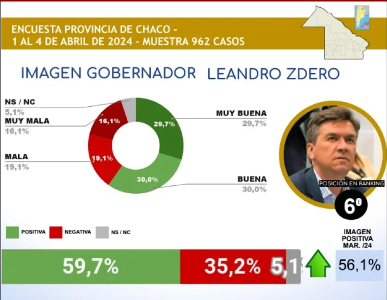 La empresa dedicada a las estadísticas midió una fuerte suba en la imagen pública del gobernador chaqueño Leandro Zdero, según el ranking desarrollado en abril 2024. El mandatario que lidera el podio es Hugo Passalacqua de Misiones con el 64,5% de opinión favorable.