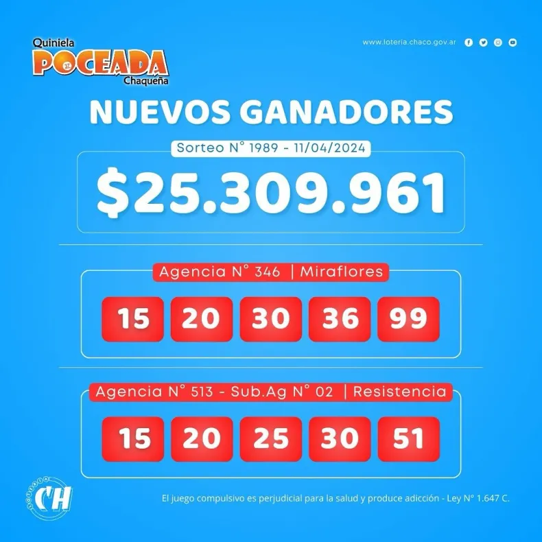 La Poceada Chaqueña dejó dos ganadores en la provincia con el sorteo N° 1989 de este jueves 11 de abril: esta vez la suerte llegó a dos vecinos, uno de Resistencia y el otro de Miraflores. Ambos se alzaron con un premio superior a los 25.000.000 de pesos.