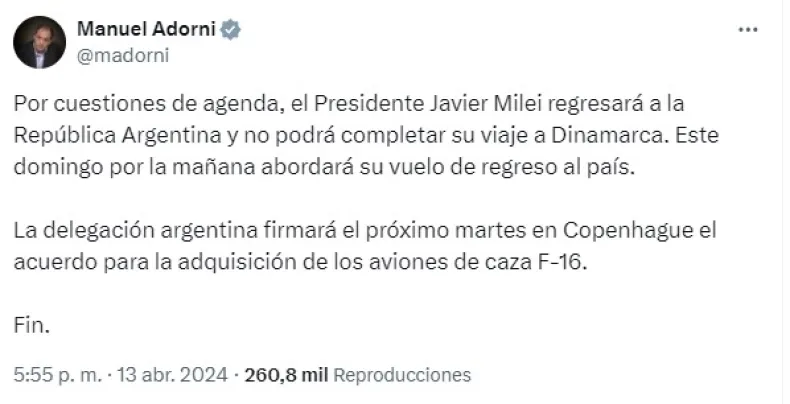 Esta tarde, el portavoz oficial de la presidencia, Manuel Adorni, confirmó que este domingo Milei volverá al país. "Por cuestiones de agenda, el Presidente Javier Milei regresará a la República Argentina y no podrá completar su viaje a Dinamarca", expuso el vocero.