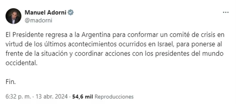 Luego, posteó: "El Presidente regresa a la Argentina para conformar un comité de crisis en virtud de los últimos acontecimientos ocurridos en Israel, para ponerse al frente de la situación y coordinar acciones con los presidentes del mundo occidental".
