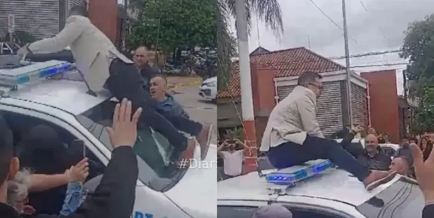 Este martes por la mañana, el concejal del CER Ángel Sánchez, protagonizó un insólito reclamo cuando se trepó al techo de un patrullero a la salida de la sesión del Concejo de Resistencia. De esta manera, Sánchez protestó en contra del desalojo de un grupo de personas que intentaban pegar carteles en las rejas del edificio.
