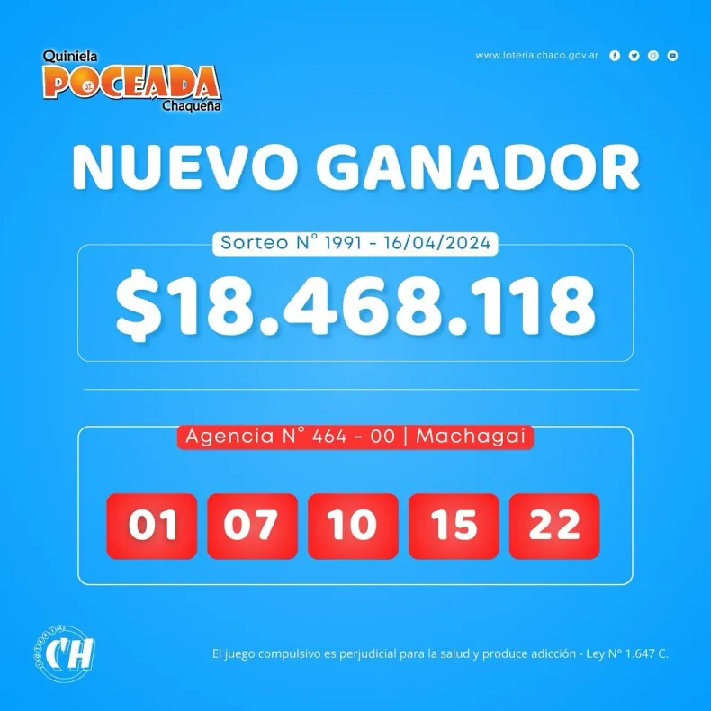 En el sorteo de este martes 16 de abril, la Poceada Chaqueña dejó un sólo ganador. El afortunado se consagró con premio superior a los 18 millones de pesos.