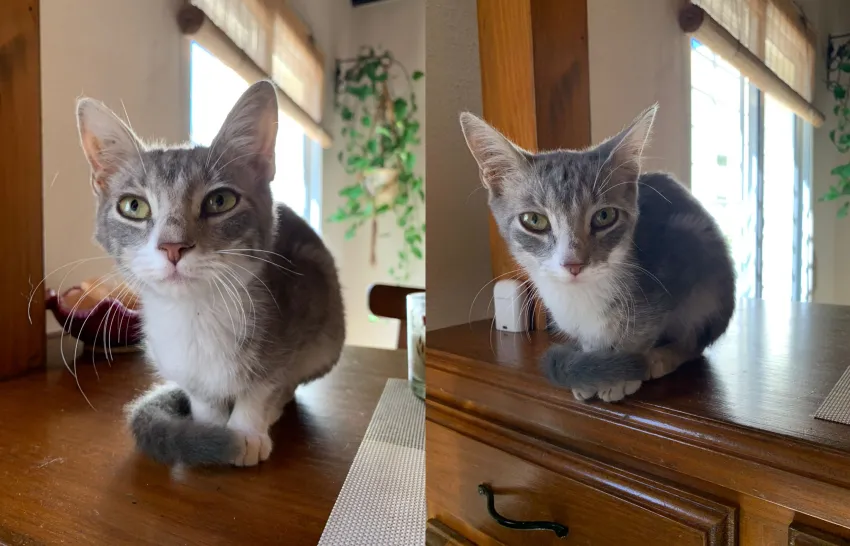 Se trata de un gatito gris que fue encontrado sobre avenida Castelli y Calle 20, en Barranqueras, cuando estaba por ser atacado por unos perros en la calle.