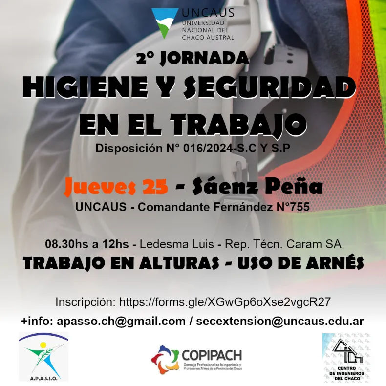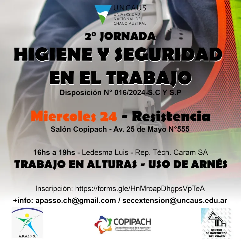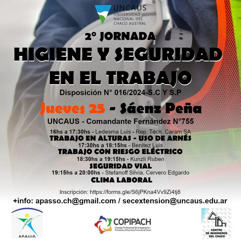 El día miércoles 24 en la ciudad de Resistencia y el jueves 25 en Presidencia Roque Sáenz Peña, se llevarán a cabo las jornadas de "Higiene y Seguridad en el Trabajo".