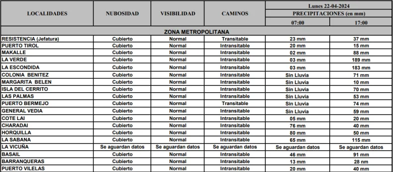 Se trata de Selva Río de Oro, mientras que otras localidades afectadas por el temporal fueron La Verde, La Escondida y La Sabana. En Resistencia, entre el mediodía y la tarde cayeron 37mm, pero hay probabilidad de tormentas para este martes.
