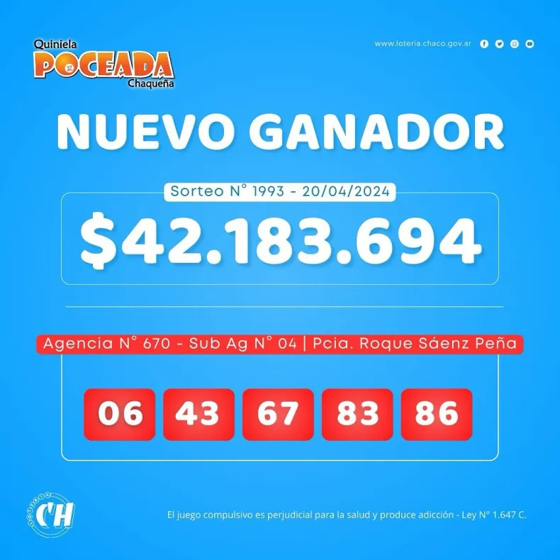 Se trató del sorteo número 1993 de la Poceada Chaqueña del sábado 20 de abril de 2024 y en esta ocasión el ganador recibió un total de $ 42.183.694.