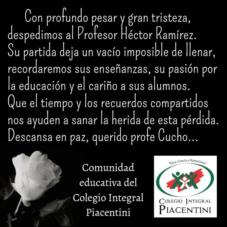 Para el docente, desde la comunidad educativa del Piacentini escribieron un sentido mensaje en redes: "Con profundo pesar y tristeza, despedimos al Profesor Héctor Ramírez. Su partida dejó un vacío imposible de llenar, recordaremos sus enseñanzas, su pasión por la educación y el cariño de sus alumnos" y finalizaba: "Que el tiempo y los recuerdos compartidos nos ayuden a sanar la herida de esta partida, descansa en paz, querido profe Cucho".