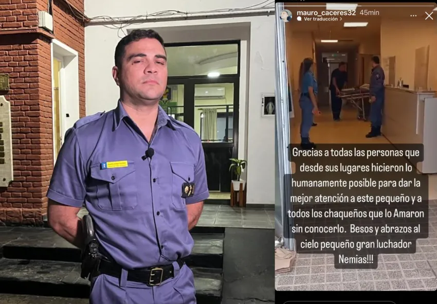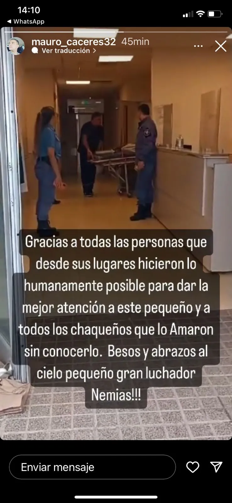 En el escrito completo el miembro de la fuerza agradeció a las personas que que acompañaron al niño: "Gracias a todas las personas que desde sus lugares hicieron lo humanamente posible para dar la mejor atención a este pequeño y a todos los chaqueños que lo amaron sin conocerlo. Besos y abrazos al cielo pequeño gran luchador Nehemías!!!" .