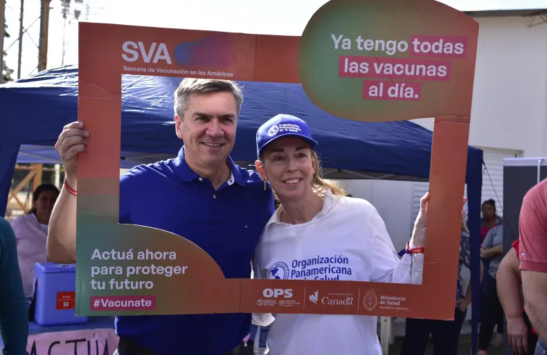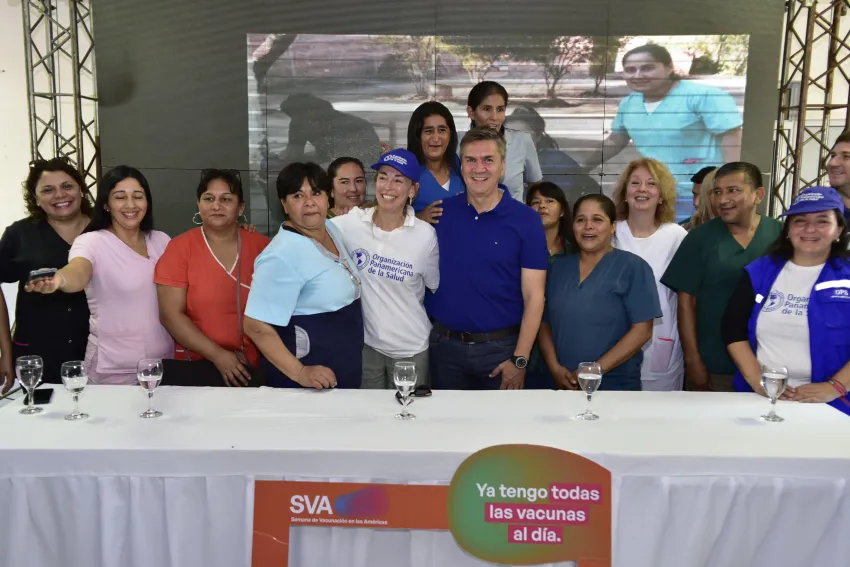 Eva Jané Llopis, de la OPS, expresó: "Es un honor tremendo estar aquí hoy, estar acompañando y haber elegido este lugar para cerrar la semana de vacunación de las Américas. Quiero desde la OPS y de la OMS extender realmente un aplauso y una felicitación a todos los profesionales y también aquí en la mesa al gran liderazgo (señalando al Gobernador y autoridades) de poner todos estos operativos en marcha y haber conseguido ya superar el número de vacunación comparado con el año pasado".