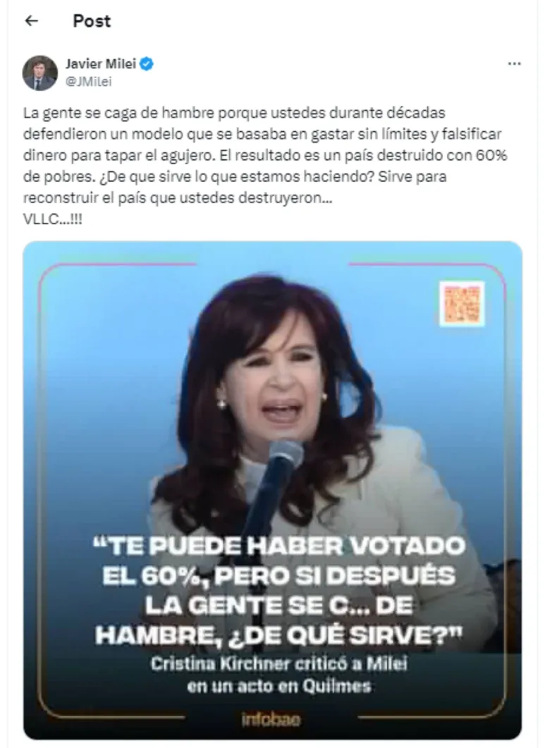 Luego de la reaparición de Cristina Kirchner en el acto en Quilmes de este sábado, donde criticó fuertemente al Gobierno y a Javier Milei, él le respondió a través de sus redes sociales y apuntó contra los gobiernos en los que participó la ex presidente.