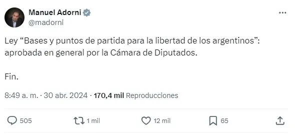Uno de los primeros en pronunciarse al respecto fue el vocero presidencial, Manuel Adorni, quien publicó: "Ley ‘Bases y puntos de partida para la libertad de los argentinos’: aprobada en general por la Cámara de Diputados. Fin".