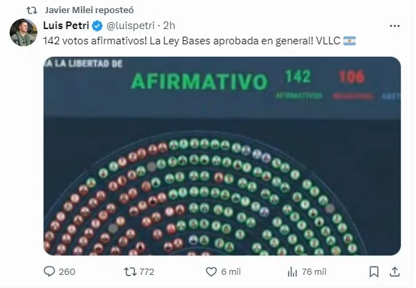 Esta mañana se logró la aprobación general de la Ley de Bases en el recinto de Diputados. Tras ellos, distintos representantes del oficialismo mostraron su alegría en las redes sociales. Si bien Milei no brindó declaraciones, sí compartió publicaciones en X.