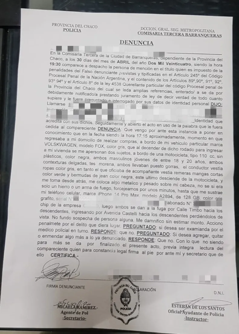 De acuerdo con la denuncia presentada, dos individuos descendieron de una motocicleta de 110 CC de color negro, sorprendiendo a la mujer y arrebatándole su celular iPhone 14 Pro Max de color gris grafito.