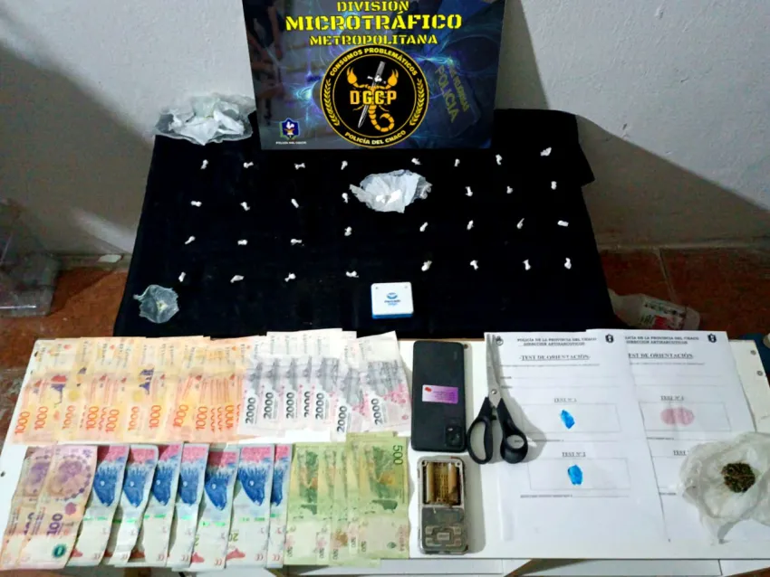 Una vez terminada la lectura del oficio judicial, la Policía comenzó con la revisión de la vivienda donde hallaron 34 envoltorios de cocaína con un pesaje de 10.5 gramos, tres gramos de marihuana, una balanza de precisión, recortes de bolsas, una tijera con restos de drogas, un celular y dinero en efectivo por la suma de $ 41.600.