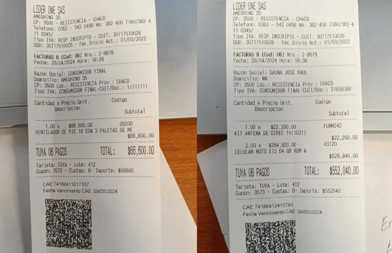 La sospechosa no intentó excusarse y manifiesto voluntaria y espontáneamente que junto a su concubino realizaron las compras denunciadas, además hizo entrega de los elementos 2 celulares, 1 parlante, 1 ventilador de pie, 1 antena con decodificador de DirecTv, 1 Documentos de Identidad, 1 Tarjeta de Crédito Tuya del NBCH, 1 Tarjeta Debito NBCH, 3 tarjetas de INSSSEP y licencias de conducir todos a nombre de la víctima y otros miembros de su familia.