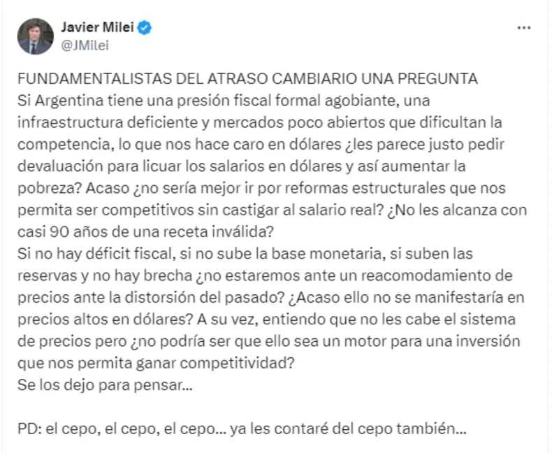 "Si Argentina tiene una presión fiscal formal agobiante, una infraestructura deficiente y mercados poco abiertos que dificultan la competencia, lo que nos hace caro en dólares", escribió Milei y cuestionó: "¿Les parece justo pedir devaluación para licuar los salarios en dólares y así aumentar la pobreza? Acaso, ¿no sería mejor ir por reformas estructurales que nos permita ser competitivos sin castigar al salario real? ¿No les alcanza con casi 90 años de una receta inválida?".