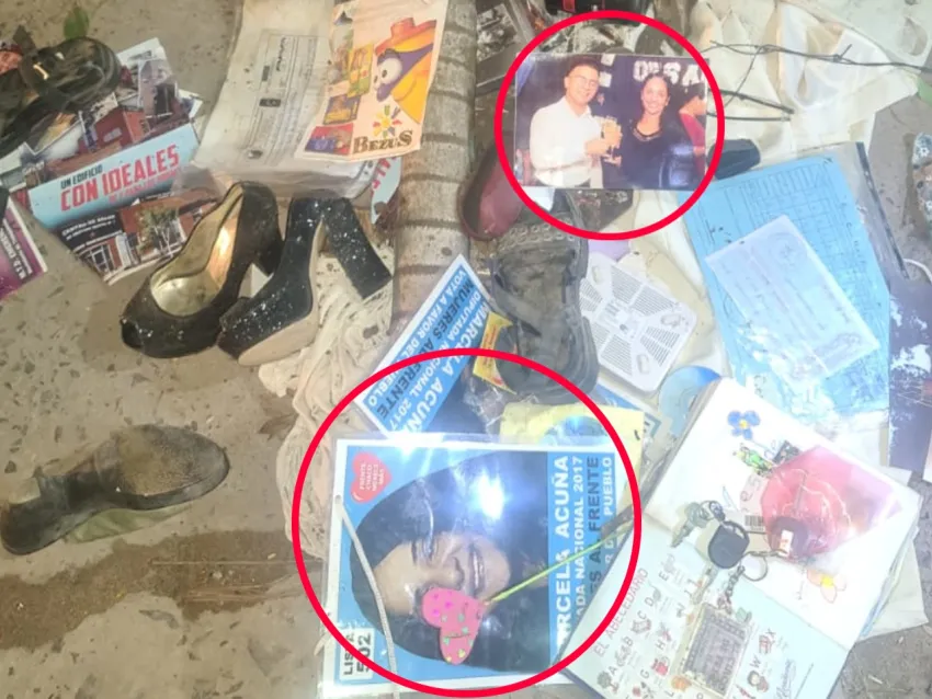 Los objetos encontrados fueron: gajos de plantas y aboles secos y verdes, 2 fotografías en las que se encuentra César Sena, 2 fotografías en las que se encuentran César Sena y Cecilia Strzyzowski, un juego de 2 llaves de vehículo marca Toyota, un llavero con cadena con plástico, otro juego de 2 llaves de vehículo Ford, un carnet plastificado con la inscripción "Asociación civil – consorcio productivo de Servicios Rurales La Victoria" y en su revés la inscripción "Fundación dr. Saul Acuña", Ticket emitido por la firma Auto Star S.R.L., de fecha 02/05/2023 por la compra de combustible Infinia Diesel, por un monto total $ 18600.38, 1 folio de plástico con 7 dispositivas de fotografías negativas con la inscripción Bezus, 1 prenda de vestir tipo blusa, 1 vestido, 2 carteles plastificados con fondo celeste con la inscripción "LISTA 502 – FRENTE CHACO MERECE MAS", y "MARCELA ACUÑA – DIPUTADA NACIONAL 2017, MUJERES AL FRENTE – VOTA A FAVOR DEL PUEBLO", 1 folio transparente que contiene una libreta escolar del alumno César Mario Sena, una musculosa, una camisa rosada, un par de zapatos, un pañuelo color rojo, con la inscripción "Partido Socialista – Unidos por el Chaco", una revista a color con la inscripción "UN EDIFICIO CON IDEALES DE Y PARA LOS POBRES" que contiene cuatro páginas del Partido Movimiento socialista Emerenciano Chaco.