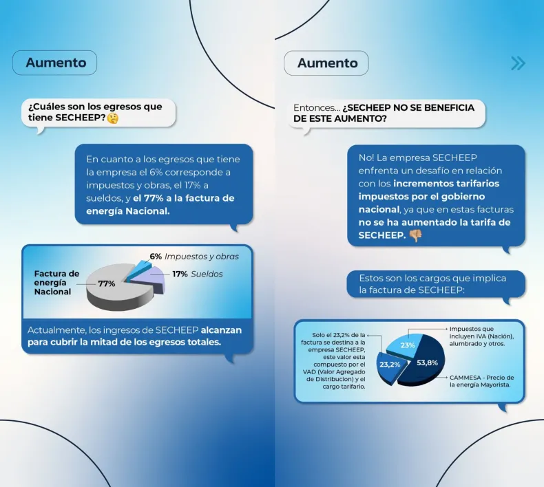 Finalmente, reiteraron: "Es importante destacar que de la factura de luz, SECHEEP solo recibe un 23,2% del pago. La empresa enfrenta el desafío de gestionar estos costos incrementados mientras intenta minimizar el impacto en sus clientes".
