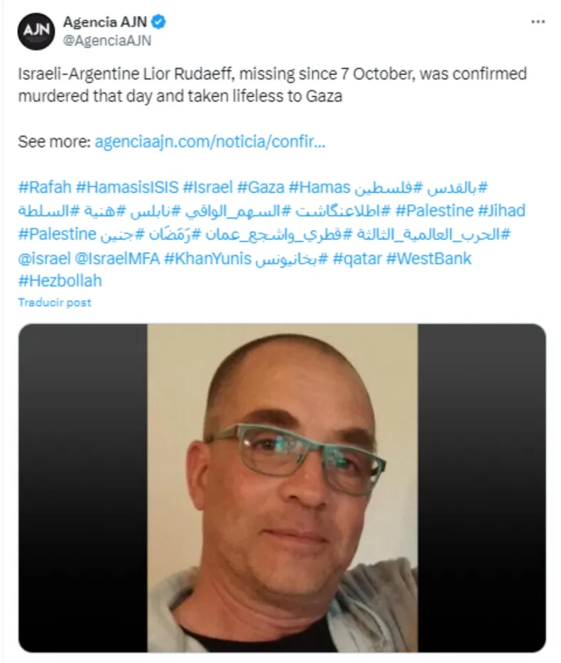Este martes, la Agencia Judía de Noticias confirmó el asesinato del argentino Lior Rudaeff de 61 años, quien fue uno de los rehenes que el grupo terrorista Hamás trasladó a la Franja de Gaza el 7 de octubre pasado.