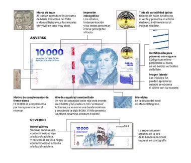 El billete de $ 10.000 tiene las imágenes de Manuel Belgrano y de María Remedios del Valle, heroína de la Guerra de la Independencia en el anverso; y la recreación artística de la escena de la Jura de la Bandera realizada el 27 de febrero de 1812 en el reverso.