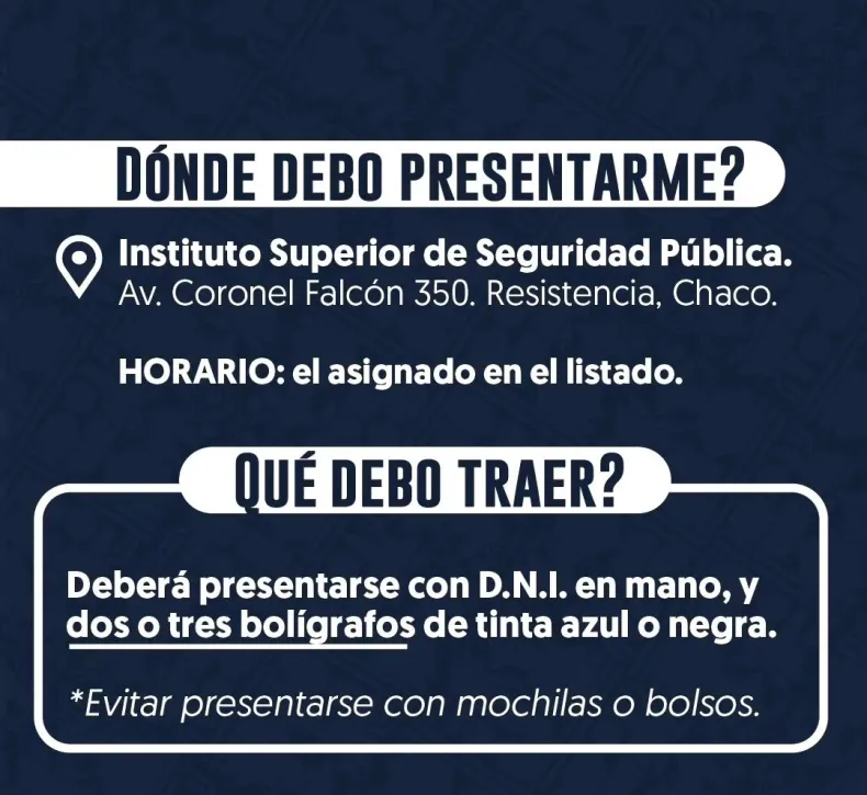 Los exámenes se llevarán a cabo los días lunes 13 y martes 14 de mayo, quienes estén habilitados a rendirlos deberán presentarse en el Instituto Superior de Seguridad Pública en la avenida Coronel Falcón al 350 en la ciudad de Resistencia. Deberán presentarse con D.N.I. y dos o tres bolígrafos de tinta azul o negra.
